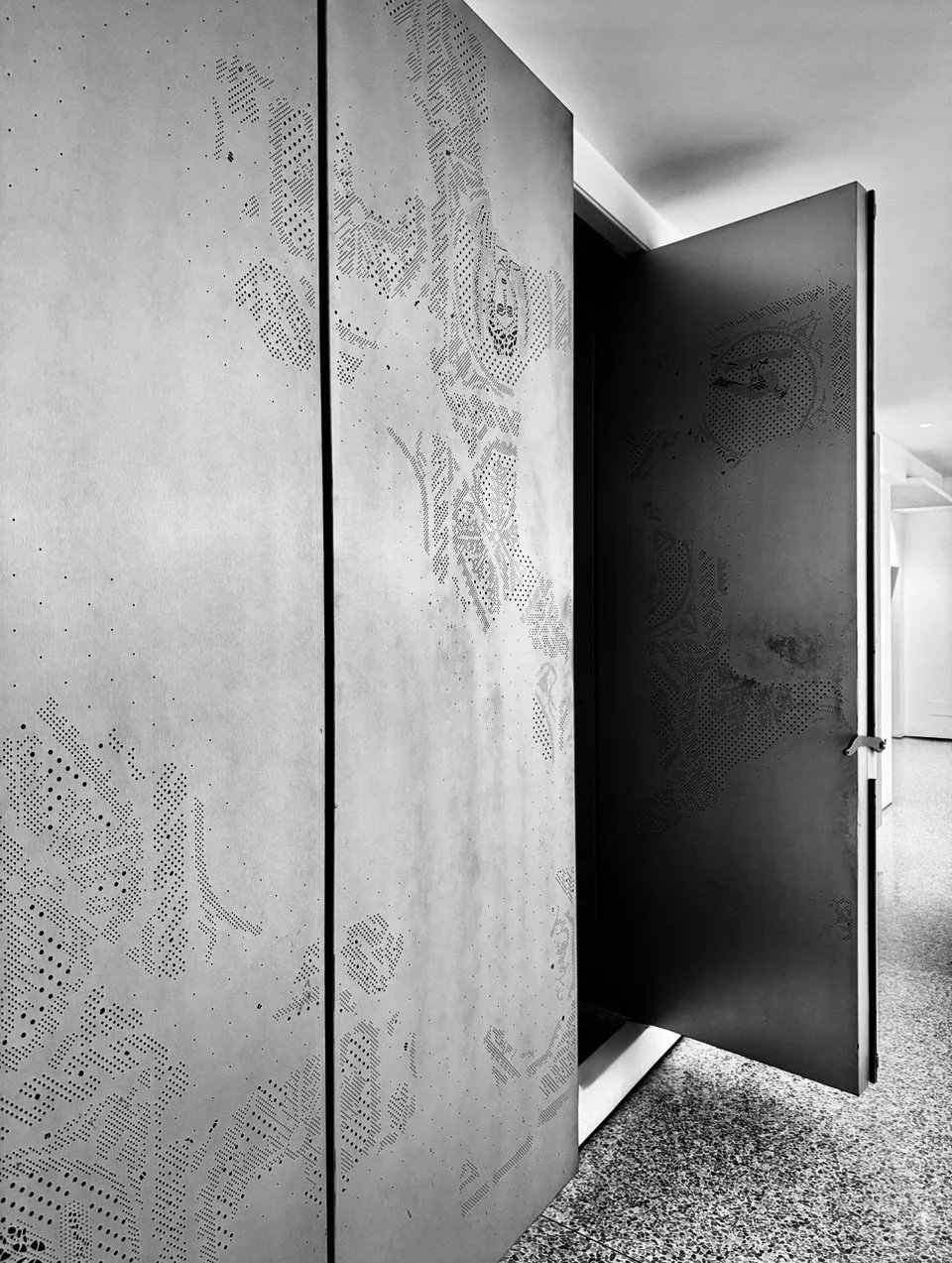 Suspended bronze panels in satin finished sheet metal reinterpret Roman mosaics unearthed on site. Laser-cut and backlight, the full height panels appear to float, supported by a concealed framework. The installation merges technical precision with sculptural poetry. (image)